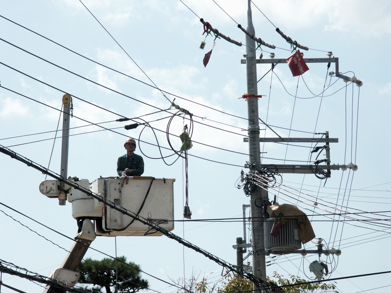 「高圧送電中 立入禁止 きんでん」と赤いぴらぴらには書いてあります。工事のおじさんのすぐ横の黄緑のぴらぴらは「接地」でしょうか。