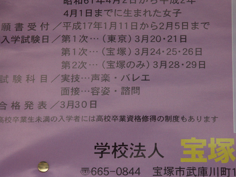 そろそろ入試シーズン到来です。私は阪急電鉄の宝塚線沿線に住んでいるのです。阪急の駅で宝塚音楽学校の学生募集のポスターが貼られているのを見つけました。で、見てみると、試験科目/……面接…容姿・諮問だって。